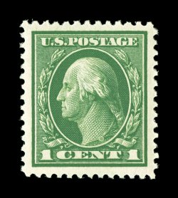 621 nhu 405 image#405, 1c Green, wonderfully well centered within lavishly large margins, sumptuously rich color and a well defined impression on fresh white paper, unblemished o.g., n.h., extremely fine; a lovely large-margined gem; 2000 PF certificate and a 2005 PSE certificate (XF-Superb 95 Jumbo; SMQ $235.00 for 95 and $840.00 for 98). (Image) $16.00