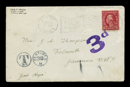 623 EDU 406 image#406, 2c Carmine, well centered single (small insect damage) tied to cover to Falmouth, Jamaica, the two cents paying only a domestic rate so charged postage due, stamp is tied by both a Boston flag machine cancel and bold violet "3d" postage due handstamp (the second earliest known strike of this woodblock marking), this cover being the February 15, 1912 earliest documented usage for this 2c Washington issue, backstamped, cover is very fine and an early date for this stamp that was issued sometime in February; 2003 PF certificate; ex-"Alpha". (Image) Est. 750-1,000