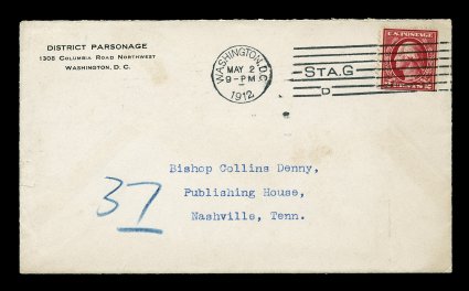 624 EDU 406a image#406a, 2c Carmine, booklet pane bottom right single, tied to a very clean and attractive District Parsonage corner card cover to Nashville, Tenn., May 2, 1912 earliest documented usage, stamp tied by exceptionally well printed Washington, D.C. machine cancel, extremely fine; this 2c is a very common value but it is decidedly scarcer from the booklet pane making this earliest documented usage very desirable, especially in this choice condition; 2003 APS certificate; ex-Hart, "Alpha". (Image) Est. 750-1,000