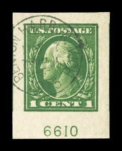 626 Ou 408 image#408, 1c Green imperforate, an eye-catching used bottom margin plate no. 6610 single, other margins are also immense, deep rich color and a razor-sharp impression, light town c.d.s. cancel, a superb used gem; 2005 PSE certificate (Gem 100- we would have thought a Jumbo designation would be appropriate; SMQ $32.00 for "only" a 98); this is the only used example to achieve Gem 100 status, the highest grade awarded to date. (Image) $0.65