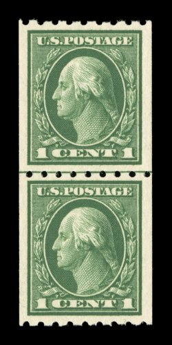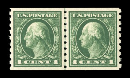 629 nhu 412 image#412, 1c Green coil, perf. 8 1/2 vert., a remarkable guide line pair that is perfectly centered within large margins, brilliantly fresh, with rich luxuriant color and a sharp impression on immaculate white paper, even the guide line is perfectly positioned between the stamps, o.g., n.h., an extremely fine gem in every regard; 2003 PF certificate and accompanied by 1990 and 2006 PSE certificates (the last graded Superb 98; SMQ $1,800.00); the highest grade assigned to any #412 to date and the only line pair to receive this superlative designation; ex-"Vineyard". (Image) $260.00