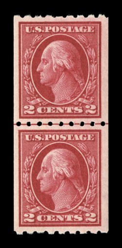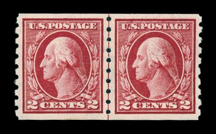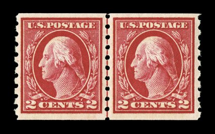 630 nh 413 image#413, 2c Carmine coil, Ty. I, perf. 8 1/2 vert., guide line pair, uncharacteristically well centered within large margins, prooflike color and impression, o.g., n.h., extremely fine; an especially scarce line pair in this choice condition; 1986 and 2006 PF certificates. (Image) $625.00