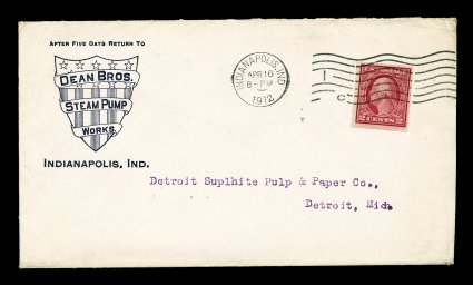 632 EDU 413 image#413, 2c Carmine coil, Ty. I, well centered single, though most perforations trimmed when applied by an affixing device, radiant color, April 16, 1912 earliest documented usage, stamp tied to fancy corner card cover with illustration on the reverse of Dean Bros. Steam Pump Works by Indianapolis, Ind. machine cancel, crisp and handsome cover, very fine; 2001 PF certificate; ex-"Alpha". (Image) Est. 750-1,000