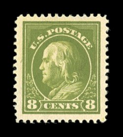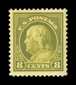 633 ogu 414 image#414, 8c Pale olive green, an eye-catching mint single, being extraordinarily well centered within immense margins, outstanding color that is incredibly deep and luxuriant, prooflike impression, o.g., lightly hinged, extremely fine; 2003 PSE certificate (XF-Superb 95 Jumbo; SMQ $165.00 for 95 and $350.00 for 98). (Image) $45.00