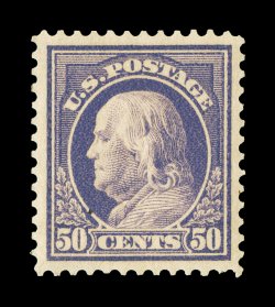 646 ogu 422 image#422, 50c Violet, double line watermark, marvelously well centered within large margins, deep vibrant color and an especially detailed impression, o.g., lightly hinged, extremely fine and choice; encapsulated PSE certificate (XF-Superb 95; SMQ $780.00); the highest grade the PSE has given to any #422. (Image) $250.00