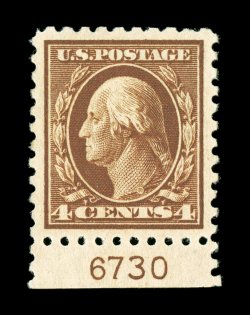 650 ogu 427 image#427, 4c Brown, handsome bottom margin plate no. 6730 single, precisely centered within unusually large margins, rich luxuriant color, o.g., l.h., an extremely fine gem; 2002 PSE certificate (Superb 98; SMQ $285.00); this is the highest grade given to any #427, being one of only two to be awarded Superb 98. (Image) $35.00