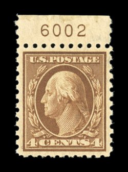651 nhu 427 image#427, 4c Brown, top margin plate no. 6002 single, excellent centering within large margins, lovely rich color, o.g., n.h., extremely fine; 2005 PSE certificate (XF 90; SMQ $290.00). (Image) $80.00