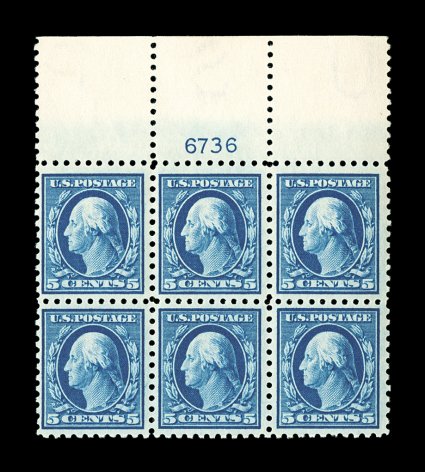 653 nhPB 428 image#428, 5c Blue, handsome full top margin plate no. 6732 block of six, exceptionally well centered, deep intense color and impression, wonderfully crisp and intact, o.g., n.h., choice very fine; 1999 PF certificate. (Image) $625.00