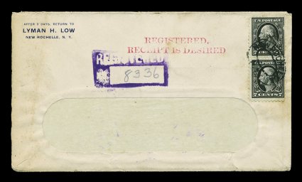656 EDU 430 image#430, 7c Black, vertical pair (perf. fault to top stamp), tied to registered return-receipt window envelope with Lyman H. Low corner card, April 14, 1915 earliest documented usage, pair tied by New Rochelle, N.Y. double oval with that city's violet registry c.d.s. PF certificate April 14th on the reverse, small cover tears by the window at bottom, fine and less common rate; this predates Scott's earliest documented usage by over two months; 2002 APS certificate; ex-"Alpha". (Image) Est. 750-1,000