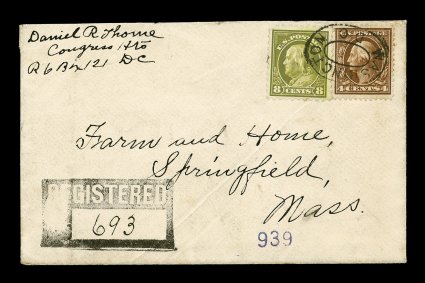 658 EDU 431 image#431, 8c Pale olive green, attractive single along with 4c Brown (#427) making a colorful franking on small registered cover, January 20, 1915 earliest documented usage, stamps tied by Washington, D.C. double oval with that city's Congress Heights Station registry c.d.s. on the reverse, backstamped Springfield, Mass., very fine and pretty cover; 2001 APS certificate; ex-"Alpha". (Image) Est. 750-1,000