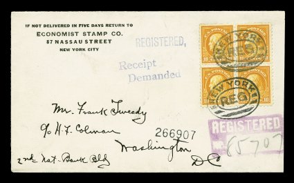 662 EDU 433 image#433, 10c Orange yellow, lovely block of four, possessing exceptional centering and brilliant color, tied to registered return-receipt cover by New York registry ovals, November 13, 1914 earliest documented usage with New York, N.Y. registry ovals of that date on the reverse and backstamped Washington, D.C. the next day, very fresh and handsome cover, very fine and choice; blocks of four are not at all common on cover making this a highly desired earliest documented usage; 2002 APS certificate; ex-"Alpha". (Image) Est. 750-1,000