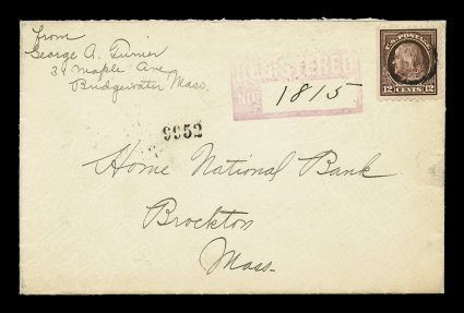 668 EDU 435 image#435, 12c Claret brown, well centered single (natural s.e. at left), on registered cover to Brockton, Mass., February 22, 1915 earliest documented usage with registry c.d.s. of Bridgewater, Mass. on reverse, backstamped, very fine and handsome; 2003 APS certificate; ex-"Alpha". (Image) Est. 750-1,000