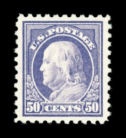 671 ogu 440 image#440, 50c Violet, a highly select mint example, possessing near perfect centering within much larger margins than typically associated with this value, gorgeous rich color and a crisp impression on immaculate white paper, fully intact and even perforations all around, o.g., lightly hinged, extremely fine; an uncommonly choice example of this scarce high value; 1995 PF certificate and a 2006 PSE certificate (XF-Superb 95; SMQ $1,550.00). (Image) $575.00
