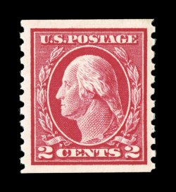 672 nh 444 image#444, 2c Carmine flat plate coil, perf. 10 vert., brilliant mint single, with radiant rich color and a vivid impression on immaculate white paper, very well centered within uncharacteristically large margins, pristine o.g., n.h., extremely fine; 1993 PSE certificate for a strip of four, this being the left stamp, and a 2004 PF certificate as a single. (Image) $110.00