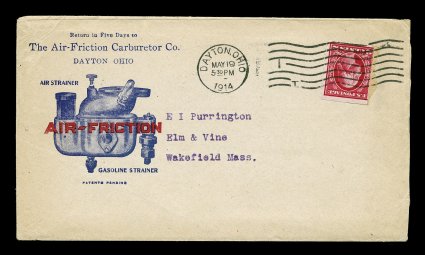 673 EDU 444 image#444, 2c Carmine flat plate coil, perf. 10 vert., unusual single from the beginning of the roll showing a fragment of the manila leader tape at left, May 19, 1914 earliest documented usage, stamp tied to front and back illustrated advertising cover of The Air-Friction Carburetor Co. by Dayton, Ohio machine cancel, very fine; an important coil variety for the Washington-Franklin collector and very early being close to the day that this was supposedly issued; 2004 APS certificate; ex-"Alpha". (Image) Est. 750-1,000