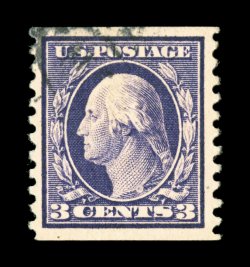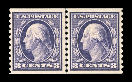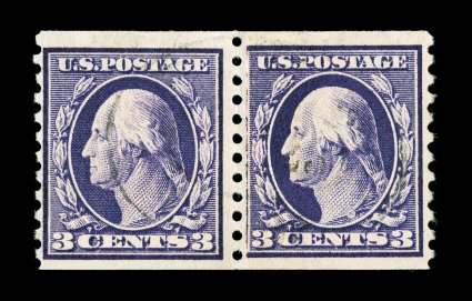 674 og 445 image#445, 3c Violet flat plate coil, perf. 10 vert., guide line pair, extraordinarily well centered within large margins, deep luxuriant color and a crisp impression, o.g., lightly hinged, extremely fine; a gem example of this rare line pair; 1997 and 2004 PF certificates. (Image) $1,300.00