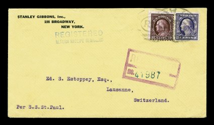 676 EDU 445 image#445, 3c Violet flat plate coil, perf. 10 vert., exceptionally nice single, well centered with excellent color, tied to cover to Switzerland along with 12c Claret brown (#435) by New York registry ovals, August 13, 1915 earliest documented usage, New York double ovals on the reverse dated both August 13th and 14th, backstamped Lausanne, edge tears at top of cover from opening, otherwise very fine; this 3c coil is very scarce in its own right on cover, and particularly so as the earliest documented usage; clear 2002 APS certificate; ex-Hadley, "Alpha". (Image) Est. 1,000-1,500