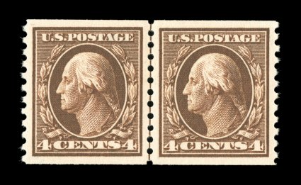 678 ogu 446 image#446, 4c Brown flat plate coil, perf. 10 vert., a remarkable quality guide line pair, perfectly centered within large margins, even the guide line is perfectly positioned between the stamps, deep luxuriant color and an especially intense impression, o.g., very lightly hinged, an extremely fine gem; 2006 PSE certificate (Superb 98; SMQ $2,400.00); this is the sole line pair to grade Superb 98, the highest grade awarded to any #446. (Image) $750.00