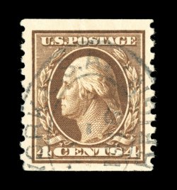 679 Ou 446 image#446, 4c Brown flat plate coil, perf. 10 vert., lovely used single, exceedingly well centered within incredibly large margins, rich color, lightly cancelled, extremely fine gem; 2004 PSE certificate (XF 90; SMQ $280.00); this is the highest grade achieved by any used #446, being one of only two (both singles) to be so graded. (Image) $65.00