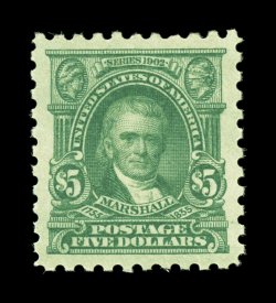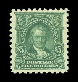 723 nhu 480 image#480, $5.00 Light green, a gem mint single that is virtually perfectly centered amid remarkable jumbo margins, wonderfully fresh color and a crisp detailed impression on bright white paper, immaculate o.g., n.h., extremely fine; while nice examples of #480 can be found, very few possess the impressive overall qualities of this stamp; 2006 PSE certificate (XF-Superb 95 Jumbo; SMQ $2,050.00 as 95 and $3,350.00 as 98). (Image) $450.00