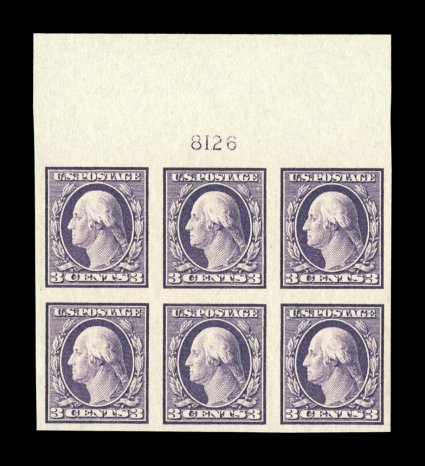 726 nhPB 483 image#483, 3c Violet, Ty. I, full top margin plate no. 8126 block of six, other three margins large and even, deep vibrant color on bright fresh paper, o.g., n.h., extremely fine and handsome. (Image) $190.00