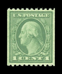 727 nhu 486 image#486, 1c Green coil, Ty. II, perf. 10 horiz., superb mint single, flawless centering, deep color, o.g., n.h., extremely fine gem; 2006 PSE certificate (Superb 98; SMQ $85.00); this is the highest grade awarded to any #486, and the sole single to receive this grade. (Image) $1.75