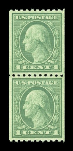 728 nhu 486 image#486, 1c Green coil, Ty. II, perf. 10 horiz., mint pair, precisely centered, strong rich color, o.g., n.h., extremely fine gem; 2006 PSE certificate (Superb 98; SMQ $165.00); this is the highest grade to date, being one of four pairs to grade Superb 98. (Image) $4.25