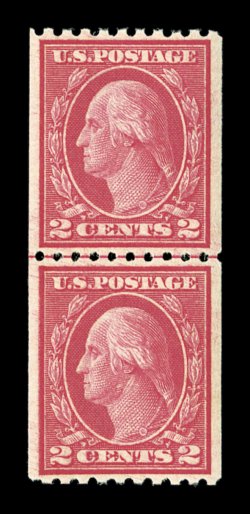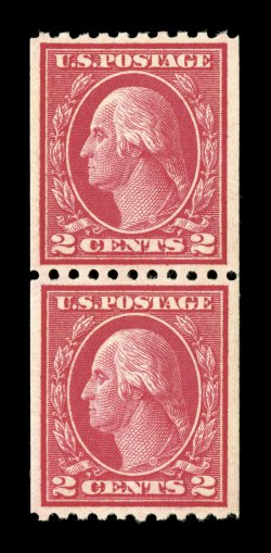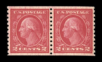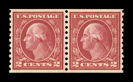 730 nhu 487 image#487, 2c Carmine coil, Ty. II, perf. 10 horiz., joint line pair, deep vibrant color, nicely centered, o.g., n.h., very fine; 1992 PF certificate and a 2006 PSE certificate (VF 80; SMQ $210.00); ex-"Vineyard". (Image) $250.00