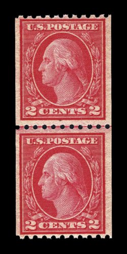 731 nhu 488 image#488, 2c Carmine coil, Ty. III, perf. 10 horiz., joint line pair, exceptionally well centered, bright fresh color, o.g., n.h., extremely fine; 2003 PSE certificate (XF 90; SMQ $290.00). (Image) $55.00