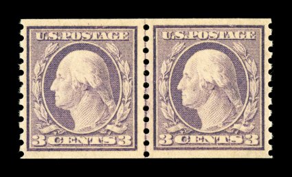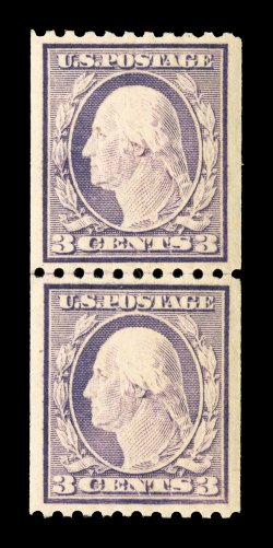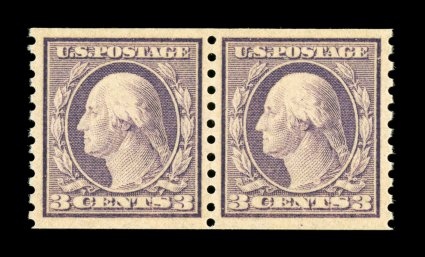 737 nhu 493 image#493, 3c Violet coil, Ty. I, perf. 10 vert., highly select mint pair, perfect centering within uncharacteristically large margins, strong bright color, o.g., n.h., superb; 2006 PSE certificate (Superb 98; SMQ $520.00); only one pair grades higher (98J). (Image) $75.00