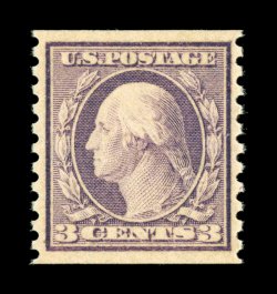 736 nhu 493 image#493, 3c Violet coil, Ty. I, perf. 10 vert., mint single, exceptionally well centered within large margins, attractive color, o.g., n.h., extremely fine; 2006 PSE certificate (XF-Superb 95; SMQ $130.00). (Image) $30.00