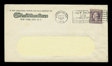 739 EDU 494 image#494, 3c Violet coil, Ty. II, perf. 10 vert., single tied by Brooklyn, N.Y. machine slogan cancel to The Charles Williams Stores corner card cover, April 16, 1918 earliest documented usage being quite close to the reported February issuance date, light corner crease to cover affecting the corner of the stamp, otherwise very fine and attractive; 1999 APS certificate; ex-"Alpha". (Image) Est. 750-1,000