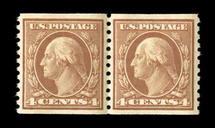 740 nhu 495 image#495, 4c Orange brown coil, perf. 10 vert., gem mint pair, excellent centering within large margins, rich bright color, o.g., n.h., extremely fine; 2006 PSE certificate (XF-Superb 95; SMQ $205.00). (Image) $50.00