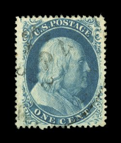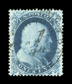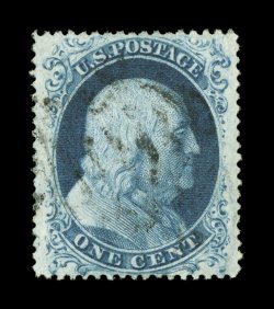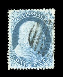 64 Ou 22 image#22, 1c Blue, Ty. IIIa, a lovely used single that is both extraordinarily well centered and unusually large margined, plus this stamp features rich luxuriant color and a crisp detailed impression on bright paper, wonderfully postmarked with a neat central strike of a scarce black carrier cancel, extremely fine; a gem used stamp with tremendous eye appeal; 1988 PF certificate (when on cover), 1999 PF certificate and a 2005 PSE certificate (XF-Superb 95; SMQ $3,100.00); this is the highest grade the PSE has awarded to any Scott #22. (Image) $600.00