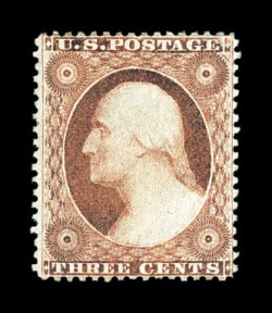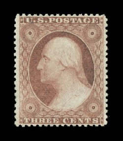 71 ogu 26 var. image#26 var., 3c Claret, Ty. II, a fabulous quality mint example of this scarcer shade variety, being incredibly well centered within much larger margins than typically found, rich claret color and a clean impression, full o.g., lightly hinged, extremely fine gem; a truly superb stamp; 2002 PSE certificate (Superb 98; SMQ does not price this grade, a 95 is $810.00); this is the highest grade the PSE has assigned a mint #26 in any shade, being one of only two so graded. (Image) $170.00
