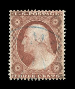 69 Ou 25 image#25, 3c Rose, Ty. I, a superlative used single of this notoriously difficult stamp, possessing impeccable centering, sumptuously rich color and an excellent clarity of impression on fresh white paper, light blue town c.d.s., extremely fine gem; this superb stamp is among the finest used 1857 Three Cent Type I stamps we have ever seen; 2002 PSE certificate (Superb 98; SMQ $4,000.00); this is the sole example of this stamp to grade Superb 98, which is by far the highest in the PSE population report, the next highest being a 90. (Image) $126.50