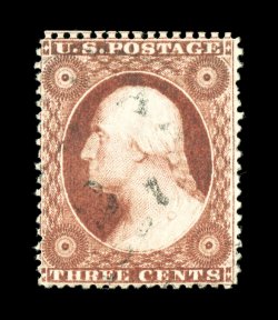 70 Ou 25 var. image#25 var., 3c Brownish carmine, Ty. I, strong rich color in a distinctive brownish carmine shade which is not listed in Scott for this stamp, nicely centered, unusually light cancel, choice very fine; 2006 PF certificate specifically identifying this as the brownish carmine shade (VF 80). (Image) $125.00+