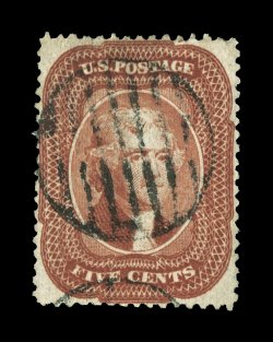 75 Ou 28A image#28A, 5c Indian red, Ty. I, an exceedingly handsome used example, possessing far better centering and much larger margins than typically associated with this rare and challenging stamp, sumptuously rich and unmistakable Indian red color, well incised impression on bright paper, boldly cancelled with a couple of strikes of a black c.d.s., as well as a portion of a red transit postmark, extremely fine; 1992 PSE certificate, 1993 PF certificate and a 2005 PSE certificate (VF-XF 85; SMQ $5,400.00); ex-Chapin. (Image) $3,575.00