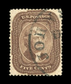 74 Ou 28 image#28, 5c Red brown, Ty. I, an impressive used single, with deep intense color and an outstanding impression on fresh paper, exceptionally well centered and margined, light town c.d.s, extremely fine; a terribly challenging stamp to find this nice; 1987 PF certificate and a 2005 PSE certificate (VF-XF 85; SMQ $2,200.00). (Image) $1,150.00