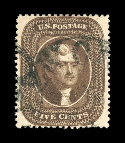 76 Ou 29 image#29, 5c Brown, Ty. I, an incredibly choice used example, featuring outstanding centering and margins for this, with its perforations completely clear of the design projections all around (rarely encountered on this stamp), particularly deep color and impression, light and neat portion of a town c.d.s., extremely fine; a terribly difficult stamp to find in this marvelous condition; 1989 PF certificate and a 2005 PSE certificate (XF-Superb 95; SMQ $2,850.00). (Image) $425.00