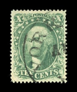 79 Ou 31 image#31, 10c Green, Ty. I, a spectacular quality used example, featuring essentially perfect centering amid extraordinarily large margins all around which are most uncommon to this issue, bright fresh color, light c.d.s. postmark, extremely fine; a terribly challenging stamp to find in this incomparable condition; 2003 PF certificate and a 2005 PSE certificate (XF-Superb 95; SMQ $6,300.00); this is the highest grade given to this stamp, being one of only two so graded. (Image) $1,200.00
