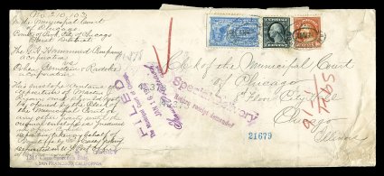 785 EDU 516 image#516, 30c Orange red, single with natural s.e. at bottom, along with 7c Black (#469) and 10c Special Delivery (#E10, natural s.e. at left with guide line), all tied to large registered special delivery court cover by San Francisco, Cal. Ferry Station ovals, January 12, 1918 earliest documented usage with that station's registry c.d.s. on the reverse, backstamped Chicago, postage pays a nine times domestic postage rate plus registry and special delivery fees, normal wear and wrinkles for a cover with bulky documents, fine; clear 2002 APS certificate; ex-"Alpha". (Image) Est. 500-750