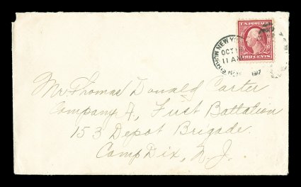 800 c 519 image#519, 2c Carmine, fresh single tied by New York, Oct. 19, 1917 c.d.s. on cover to New Jersey, stamp is well centered and with strong color in the characteristic genuine shade, very fine; an especially rare 20th century stamp to find correctly used on cover; 1984 PF certificate; ex-Stollnitz. (Image) $2,750.00