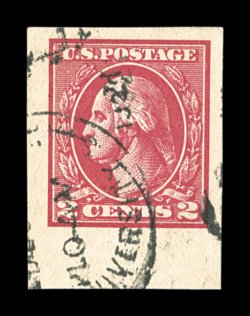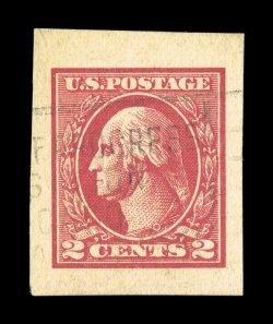 821 O 534B image#534B, 2c Carmine offset imperforate, Ty. VII, an especially handsome bottom sheet-margin used single, other three margins also quite large, wonderfully bright color and a clean impression on fresh paper, fairly light duplex cancel, extremely fine; a highly desirable gem used example of this scarce stamp; 1976 and 1998 PF certificates. (Image) $1,250.00