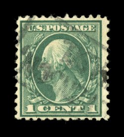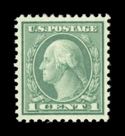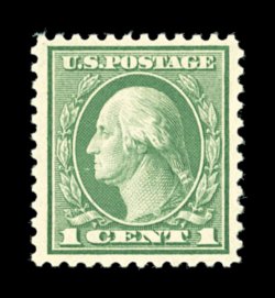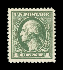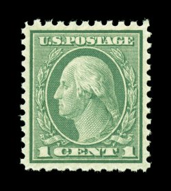 826 nhu 538 image#538, 1c Green coil waste, perf. 11x10, a remarkably choice mint example of this challenging stamp, impeccably well centered within larger margins than typically found on this coil waste stamp, lovely rich color and an excellent clarity of impression, o.g., n.h., extremely fine; 2002 PSE certificate (Superb 98; SMQ $860.00); only one stamp grades slightly higher (98J). (Image) $22.50
