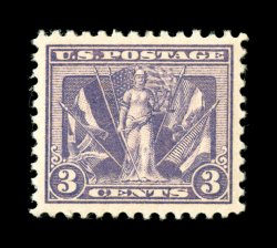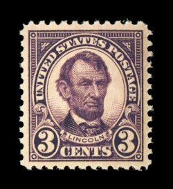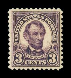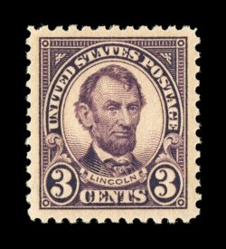 838 nhu 555 image#555, 3c Violet, extraordinarily well centered within particularly large margins, deep color and a strong impression, pristine o.g., n.h., an extremely fine gem; 2007 PSE certificate (XF-Superb 95 Jumbo; SMQ $345.00 for 95 and $970.00 for 98). (Image) $37.50
