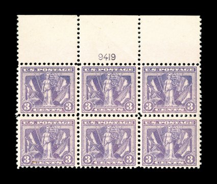 825 nhPB 537 image#537, 3c Violet, full top margin plate no. 9419 block of six, well centered for this surprisingly difficult commemorative plate block, strong color, o.g., n.h., flat plate bend in the selvage, choice very fine. (Image) $300.00