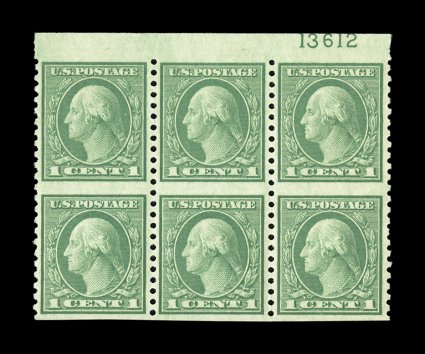 827 ogPB 538a image#538a, 1c Green coil waste, vertical pair, imperforate horizontally, full top margin plate no. 13612 block of six containing three error pairs, being a plate block of four plus and additional pair at left, exceptionally fresh, well centered, o.g., faintly hinged, extremely fine; 2006 PF certificate. (Image) $950.00+