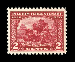 835 nhu 549 image#549, 2c Pilgrim Tercentenary, an especially attractive mint example, displaying an intense "fiery" color and vivid impression, remarkably well centered within uncharacteristically large margins, unblemished o.g., n.h., extremely fine an quite choice; 2006 PSE certificate (XF-Superb 95; SMQ $240.00). (Image) $14.00