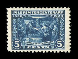836 og 550 image#550, 5c Pilgrim Tercentenary, exceptionally well centered within incredibly wide margins, intensely rich color and impression on fresh paper, o.g., l.h., extremely fine and quite striking; 2006 PSE certificate. (Image) $45.00